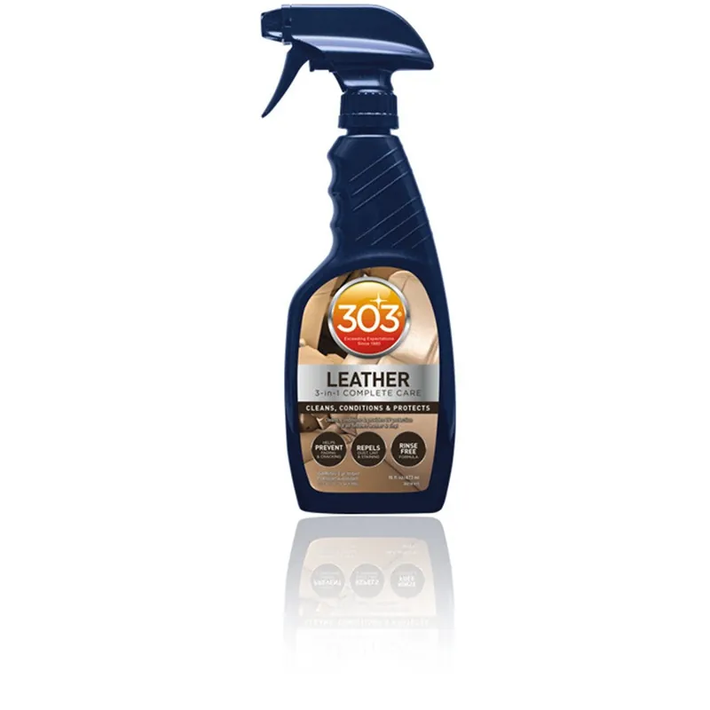 303(R) Automotive Leather 3-in-1 Complete Care cleans, conditions and provides UV protection to all finished leather and vinyl. It will help clean up surface dirt and grime, as will help repel future dust, lint and stains.It also contains superior UV protection to prevent fading and cracking of the leather caused by the sun’s harmful UV rays.Easy to use formula, just spray on and wipe off.
