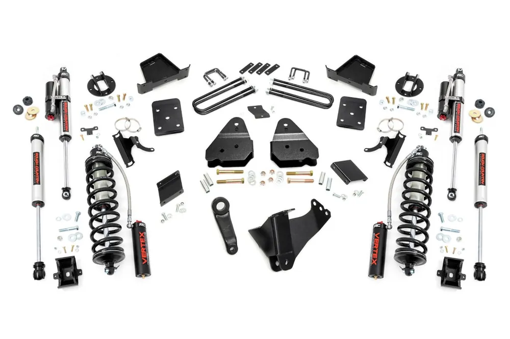 Explore New Heights. Give your third-generation Ford Super Duty superior lift height with Rough Country’s 6-inch Coilover Suspension Lift Kit! This all-inclusive kit comes with everything you need for a total transformation of your truck. Run up to 37in tires while preserving the smooth, factory ride quality with this impressive upgrade.\\Durable Components. When changing a vehicle’s suspension, the key to preserving ride quality is keeping the geometry of all suspension components as close to their factory angles as possible. Rough Country’s new 6-inch Suspension Lift features a set of ultra-durable radius arm drop brackets, precision fit to bolt right into the factory mounts for an easier install and a more factory-like angle. Utilizing this conversion kit you’re removing the factory independent coil shock and coil set-up and replacing it with a massive 2.5in piston, nitrogen-charged, 8-stage adjustable Vertex Coilover. Rough CountryΓÇÖs Vertex Coilovers feature a monotube design with an external reservoir for increased oil capacity and damping sensitivity. When it comes to investing in a high-end kit, youΓÇÖll be pleased to find that Rough CountryΓÇÖs 2.5in piston design is beefier and offers an impressive 56% greater fluid capacity than the average reservoir shock. Each kit is paired with a monotube shock that provides optimal damping control.\\Installation. Requiring cutting and drilling to install, an estimated timeframe of 6-10 hours is recommended to complete this full installation. This full kit can be installed at home and can be completed efficiently and quickly!\\Limited Lifetime Replacement Warranty. Rough Country’s 6-inch Coilover Suspension Lift Kit is backed with a limited lifetime replacement warranty towards manufacturer defects. As such, the product is protected from structural and workmanship damage after the date of purchase. With our industry-leading warranty give yourself peace of mind when using Rough Country’s Suspension products!