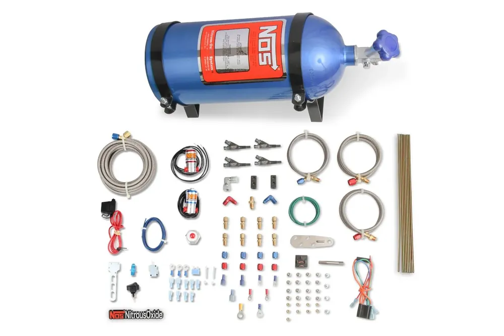 Engineered for precise distribution of nitrous and fuel for all domestic and foreign carbureted/EFI 4, 6, 8 cyl. & Rotary engines. The NOS Sportsman Fogger Systems offer superior atomization and tuning by injecting precisely measured amounts of fuel and nitrous into each individual port with our patented Fogger Nozzles. Power levels are adjustable by changing nitrous and fuel jets in each Fogger Nozzle. The latest in high-tech solenoid technology allows for an extreme degree of reliability with jetting adjustability ranging from a 50 to a 150 extra HP gain. All Sportsman Fogger Systems include a 10 lb. capacity nitrous bottle, Powershot nitrous and fuel solenoids, Fogger nozzles, aircraft quality steel braided hose, and all other necessary electrical and mounting hardware for a complete installation. Requires removal of intake manifold for plumbing.
