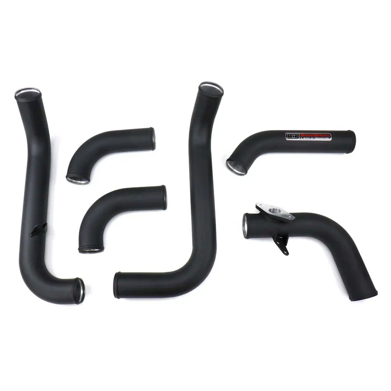 This is the GrimmSpeed FMIC Piping Kit. This kit includes a set of aluminum pipes designed specifically for the GrimmSpeed Front Mount Intercooler Core. These pipes feature smooth bends to allow for a quick and responsive boost while optimizing the intake charger temperatures. Grimmspeed crafted these pipes to contour around the shape of the chassis for a great fitment, and are available in a few color options for those of you who want to enhance the theme of your engine bay.
