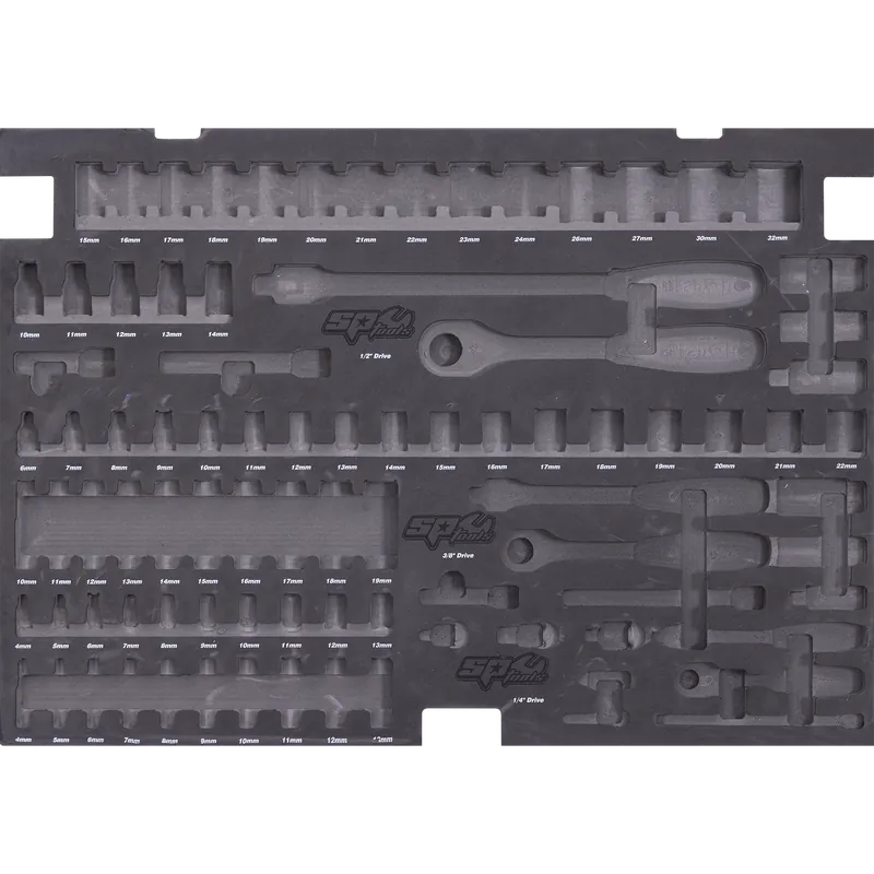 - EVA Hi-Density Foam Storage inserts – cut to shadow your tools.Offers extra protection for your SP ToolsKeeps your tool kit organised for rapid tool location and instant useEasy identification of missing toolsDIMENSIONS660w x 435d (mm)THIS EMPTY EVA FOAM TRAY BEST FITS THE FOLLOWING TOOLS(NOT INCLUDED)EVA Foam Tray Tool Kit – Sockets & Accessories – 88pc – Metric Only (SP50010)1/4″Dr SOCKETS & ACCESSORIES12pt – 4, 5, 6, 7, 8, 9, 10, 11, 12 & 13mm12pt Deep – 4, 5, 6, 7, 8, 9, 10, 11, 12 & 13mm45T Ratchet, Flex Handle & Universal JointExtension Bars – 50 & 150mm3/8″Dr SOCKETS & ACCESSORIES12pt – 6, 7, 8, 9, 10, 11, 12, 13, 14, 15, 16, 17, 18, 19, 20, 21 & 22mm12pt Deep – 10, 11, 12, 13, 14, 15, 16, 17, 18 & 19mmSpark Plug Sockets – 16 & 21mm45T Ratchet, Flex Handle & Universal JointExtension Bars – 75 & 150mmAdaptors – 3/8Fx1/4M & 3/8Fx1/2M1/2″Dr SOCKETS & ACCESSORIES12pt – 10, 11, 12, 13, 14, 15, 16, 17, 18, 19, 20, 21, 22, 23, 24, 26, 27, 30 & 32mmSpark Plug Sockets – 16 & 21mm45T Ratchet, Flex Handle & Universal JointExtension Bars – 75 & 125mmAdaptor – 1/2Fx3/8MNOTE:This EVA foam trayDOES NOTInclude tools