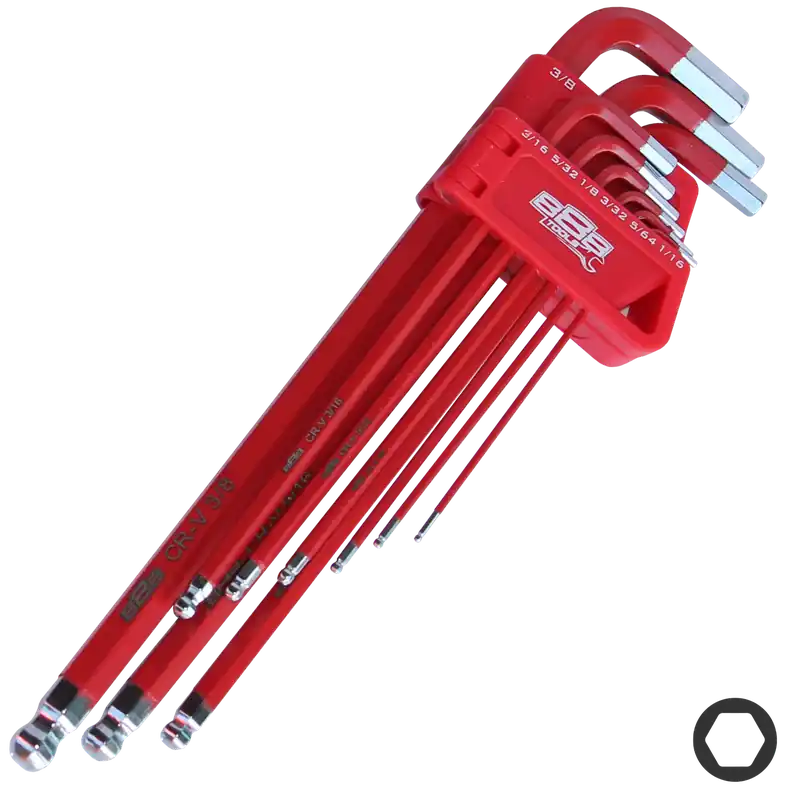 - 1/16, 5/16, 3/32, 1/8, 5/32, 3/16, 1/4, 5/16 & 3/8″ SAE Hex Keys