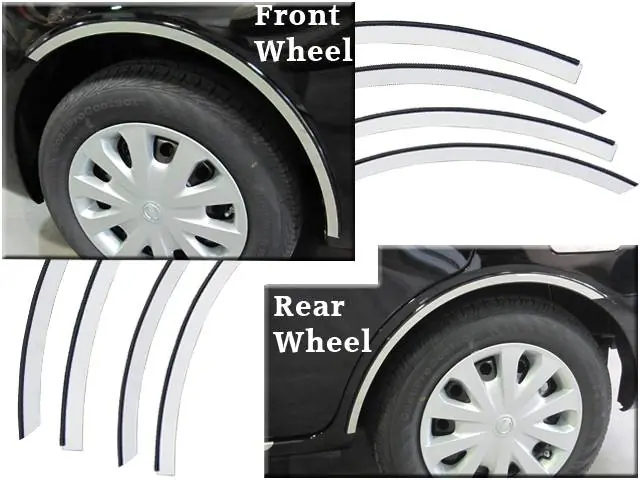 WHEEL WELL FENDER Accessory Trim has a very low profile against the vehicle. A rubber gasket edging is applied to the upper edge to provide added visibility and protection. Wheel Well Fender Accessory Trim is pre-formed for each model from a Highly Polished Stainless Steel, with a full 3M acrylic foam adhesive backing to enhance the look of your vehicle.