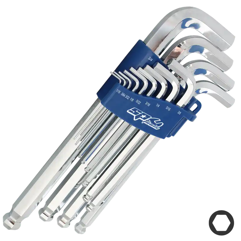 - 1/16″, 5/64″, 3/32″, 1/8″, 5/32″, 3/16″, 1/4″, 5/16″, 3/8″, 1/2, 9/16, 5/8 & 3/4 Jumbo Hex Keys