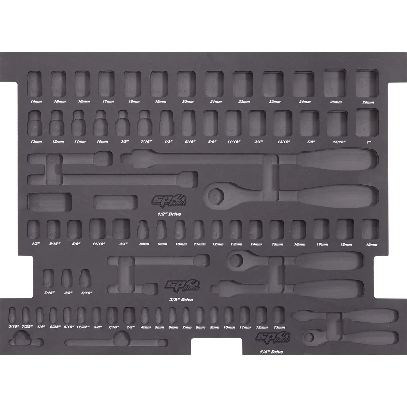 - EVA Hi-Density Foam Storage inserts – cut to shadow your tools.Offers extra protection for your SP ToolsKeeps your tool kit organised for rapid tool location and instant useEasy identification of missing toolsDIMENSIONS590w x 440d (mm)THIS EMPTY EVA FOAM TRAY BEST FITS THE FOLLOWING TOOLS(NOT INCLUDED)EVA Foam Tray Tool Kit – Sockets & Accessories – 81pc – Metric & SAE (SP50003)1/4″Dr SOCKETS & ACCESSORIES12pt – 4, 5, 6, 7, 8, 9, 10, 11, 12 & 13mm12pt – 3/16, 7/32, 1/4, 9/32, 5/16, 11/32, 3/8, 7/16 & 1/2″45T Ratchet & Flex HandleWobble Extension Bars – 50 & 150mm3/8″Dr SOCKETS & ACCESSORIES12pt – 8, 9, 10, 11, 12, 13, 14, 15, 16, 17, 18 & 19mm12pt – 5/16, 3/8, 7/16, 1/2, 9/16, 5/8, 11/16 & 3/4″45T Ratchet & Flex HandleWobble Extension Bars – 75 & 150mm1/2″Dr SOCKETS & ACCESSORIES12pt – 10, 11, 12, 13, 14, 15, 16, 17, 18, 19, 20, 21, 22, 23, 24, 25 & 26mm12pt – 3/8, 7/16, 1/2, 9/16, 5/8, 11/16, 3/4, 13/16, 7/8, 15/16 & 1″45T Ratchet & Flex HandleWobble Extension Bars – 125 & 250mmSpark Plug Sockets – 5/8 & 13/16″NOTE:This EVA foam trayDOES NOTInclude tools