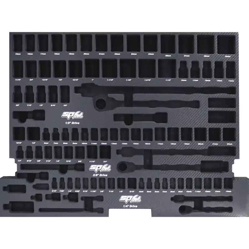 - EVA Hi-Density Foam Storage inserts – cut to shadow your tools.Offers extra protection for your SP ToolsKeeps your tool kit organised for rapid tool location and instant useEasy identification of missing toolsDIMENSIONS590w x 415d (mm)THIS EMPTY EVA FOAM TRAY BEST FITS THE FOLLOWING TOOLS(NOT INCLUDED)EVA Foam Tray Tool Kit – Premium – Sockets & Accessories – 105pc – Metric & SAE (SP50006M)1/4″Dr SOCKETS & ACCESSORIES12pt – 4, 5, 6, 7, 8, 9, 10, 11, 12, 13 & 14mm12pt – 3/16, 7/32, 1/4, 9/32, 5/16, 11/32, 3/8, 7/16, 1/2 & 9/16″60T Ratchet, Flex Handle & Universal JointWobble Extension Bars – 50 & 150mm3/8″Dr SOCKETS & ACCESSORIES12pt – 6, 7, 8, 9, 10, 11, 12, 13, 14, 15, 16, 17, 18, 19, 20, 21 & 22mm12pt – 1/4, 5/16, 3/8, 7/16, 1/2, 9/16, 5/8, 11/16, 3/4, 13/16 & 7/8″Spark Plug Sockets – 5/8 & 13/16″60T Ratchet, Flex Handle & Universal JointWobble Extension Bars – 75 & 150mmAdaptors – 3/8Fx1/4M & 3/8Fx1/2M1/2″Dr SOCKETS & ACCESSORIES12pt – 10, 11, 12, 13, 14, 15, 16, 17, 18, 19, 20, 21, 22, 23, 24, 26, 27, 30 & 32mm12pt – 3/8, 7/16, 1/2, 9/16, 5/8, 11/16, 3/4, 13/16, 7/8, 15/16, 1, 1-1/16, 1-1/8, 1-3/16 & 1-1/4″Spark Plug Sockets – 5/8 & 13/16″60T Ratchet, Flex Handle & Universal JointWobble Extension Bars – 75 & 125mmAdaptor – 1/2Fx3/8MNOTE:This EVA foam trayDOES NOTInclude tools