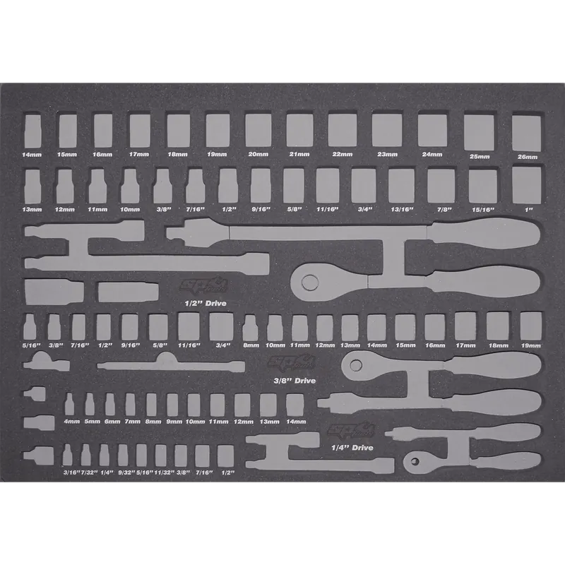- EVA Hi-Density Foam Storage inserts – cut to shadow your tools.Offers extra protection for your SP ToolsKeeps your tool kit organised for rapid tool location and instant useEasy identification of missing toolsDIMENSIONS560w x 400d (mm)THIS EMPTY EVA FOAM TRAY BEST FITS THE FOLLOWING TOOLS(NOT INCLUDED)EVA Foam Tray Tool Kit – Sockets & Accessories – 84pc – Metric & SAE (SP50004)1/4″Dr SOCKETS & ACCESSORIES12pt – 4, 5, 6, 7, 8, 9, 10, 11, 12, 13 & 14mm12pt – 3/16, 7/32, 1/4, 9/32, 5/16, 11/32, 3/8, 7/16 & 1/2″45T Ratchet & Flex HandleWobble Extension Bars – 50 & 150mm3/8″Dr SOCKETS & ACCESSORIES12pt – 8, 10, 11, 12, 13, 14, 15, 16, 17, 18 & 19mm12pt – 5/16, 3/8, 7/16, 1/2, 9/16, 5/8, 11/16 & 3/4″Spark Plug Sockets – 5/8 & 13/16″45T Ratchet & Flex HandleWobble Extension Bars – 75 & 150mmAdaptors – 3/8Fx1/4M & 3/8Fx1/2M1/2″Dr SOCKETS & ACCESSORIES12pt – 13, 14, 15, 16, 17, 18, 19, 20, 21, 22, 23, 24, 25, 26, 27, 30 & 32mm12pt – 1/2, 9/16, 5/8, 11/16, 3/4, 13/16, 7/8, 15/16, 1, 1-1/16, 1-1/8 & 1-1/4″45T Ratchet & Flex HandleWobble Extension Bars – 125 & 250mmAdaptor – 1/2Fx3/8MNOTE:This EVA foam trayDOES NOTInclude tools