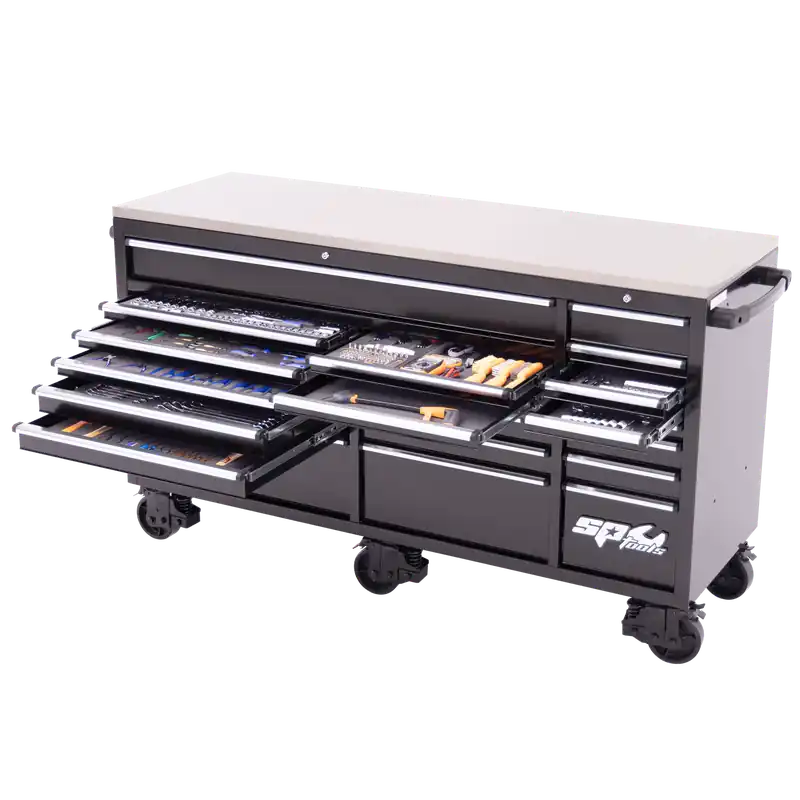 Super Sale SP Tools 73″ USA Sumo Series Roller Cabinet Tool Kit – 465pc – Metric & SAE – Black/Chrome