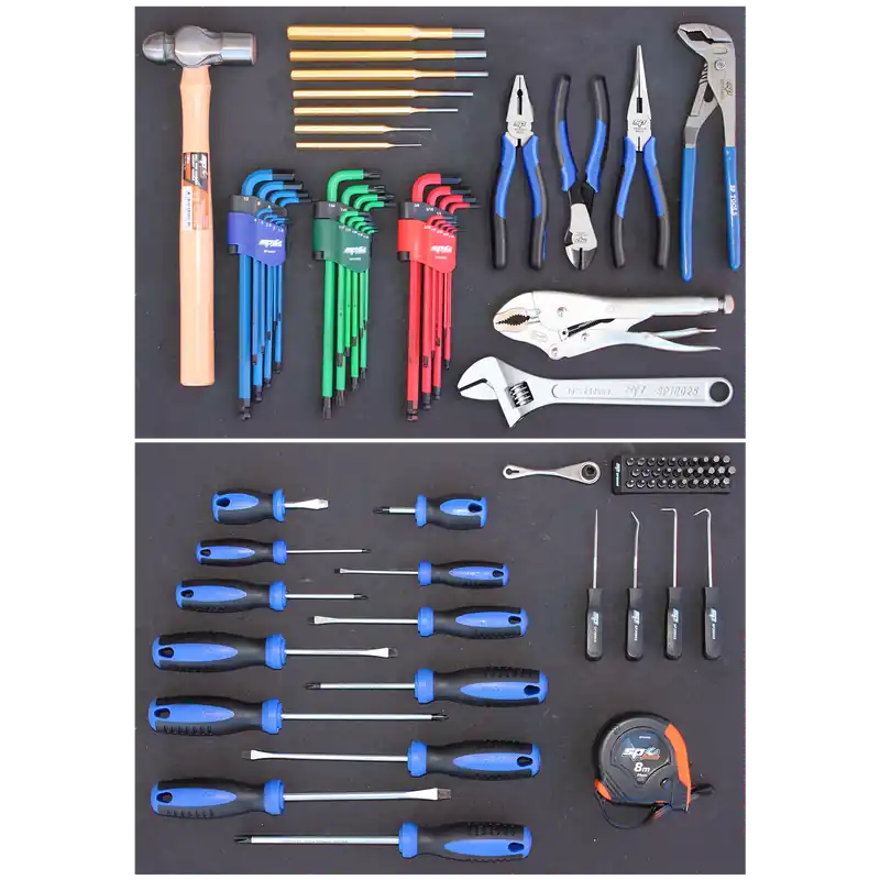 - TOOLS INCLUDED IN THIS TOOL KITScrewdrivers – 3.0×75, 5.5×100, 6.5×38, 6.5×100, 6.5×150 & 8.0x150mmScrewdrivers – #0x75, #1×75, #2×38, #2×100, #2×150 & #3x150mmRatchet Driver Bit Set – 31pcHex Keys – 1.5, 2, 2.5, 3, 4, 5, 6, 8 & 10mmHex Keys – 1/16, 5/64, 3/32, 1/8, 5/32, 3/16, 1/4, 5/16 & 3/8″Torx Keys -T10, T15, T20, T25, T27, T30, T40, T45 & T50Pliers – Combination, Long Nose, Multigrips & LockingCutters – DiagonalAdjustable WrenchHammer – Ball PeinPin Punch Set – 7pcPick Set – 4pcTape Measure*Images are for illustration purposes only, contents may vary.NOTE: Tools only, No EVA foam tray included