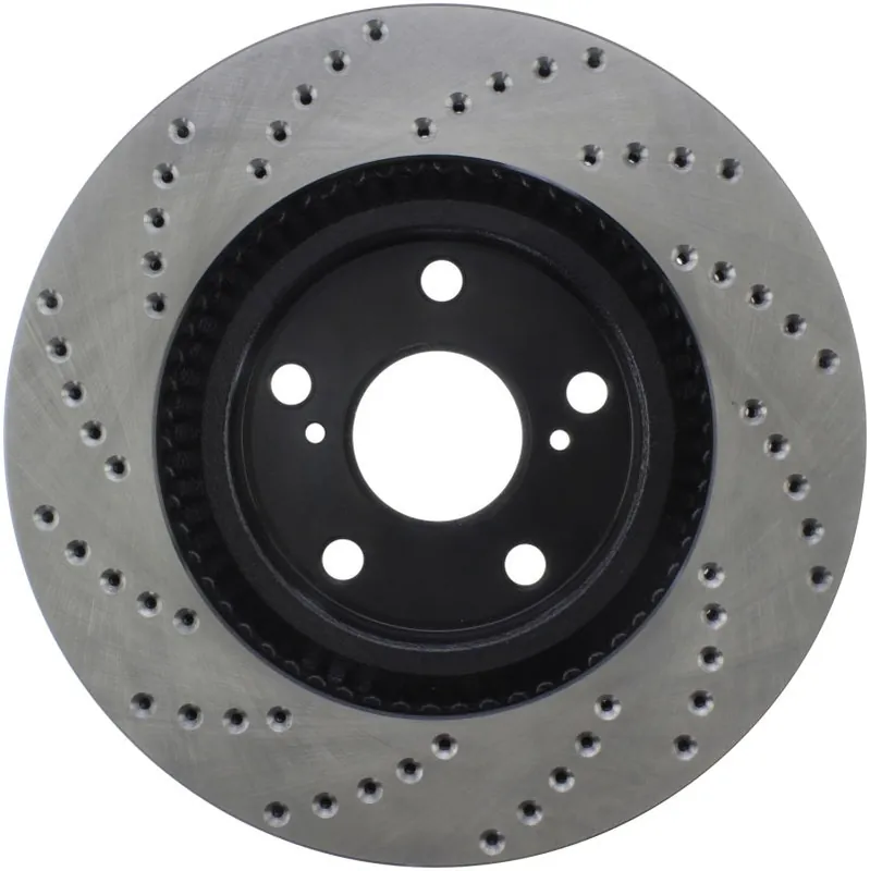 StopTech Drilled Sport Rotors are 1-piece direct replacement brake discs for factory brake systems and stock calipers that look great behind your wheels – and offer significantly improved braking performance. The unique cross-drilling aids with heat and brake dust dispersal; prevents glazing of the pads; adds bite and improves wet and dry braking performance. Built to last; the black e-coating provides protection from corrosion and the high carbon metallurgy (in most applications) offers quieter operation; better crack resistance and increased performance.